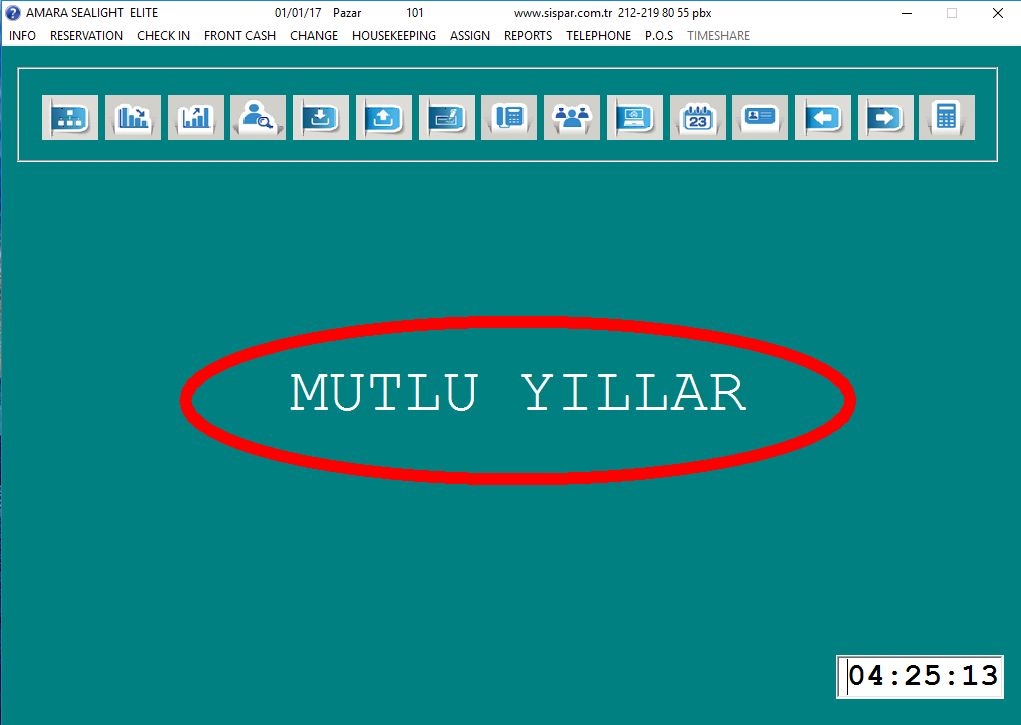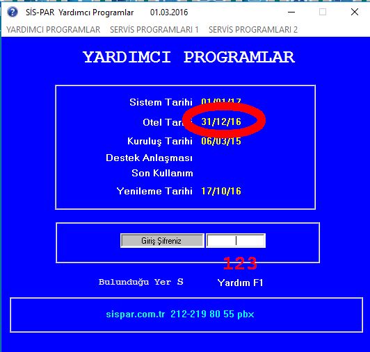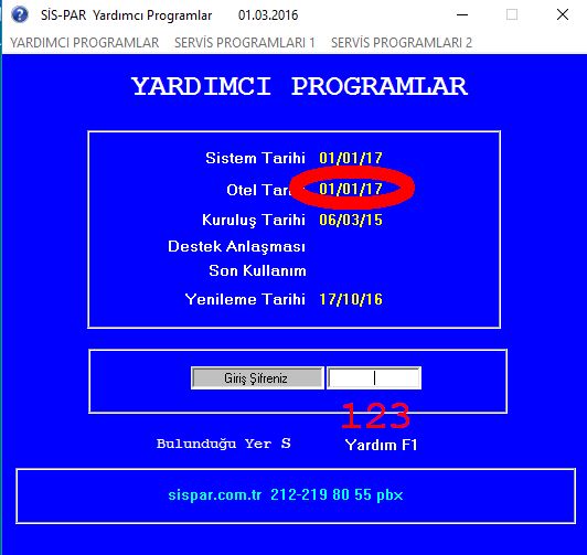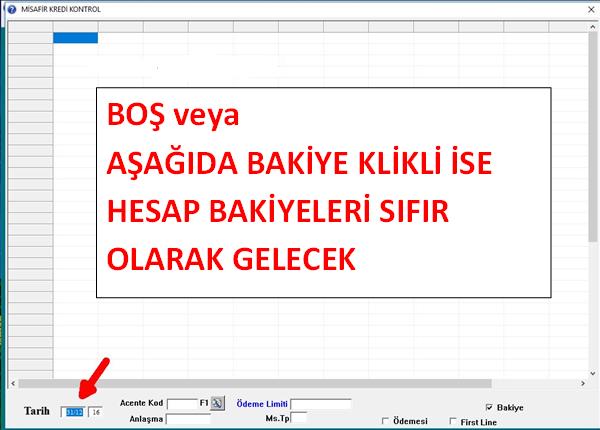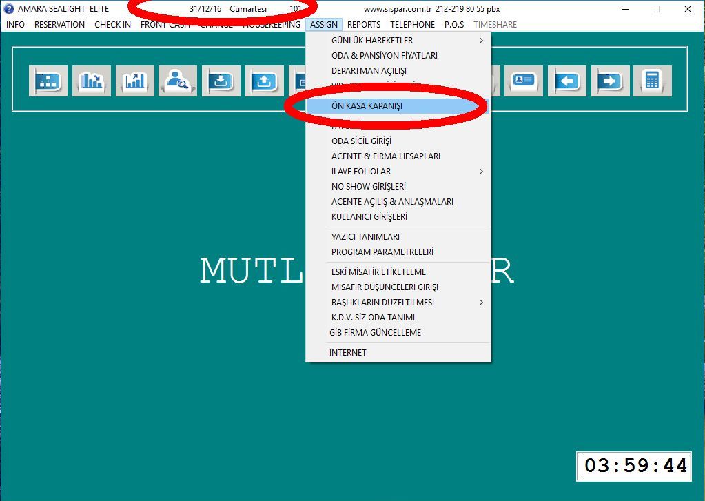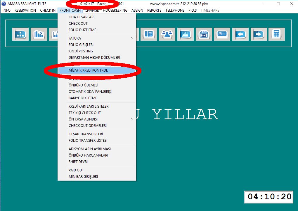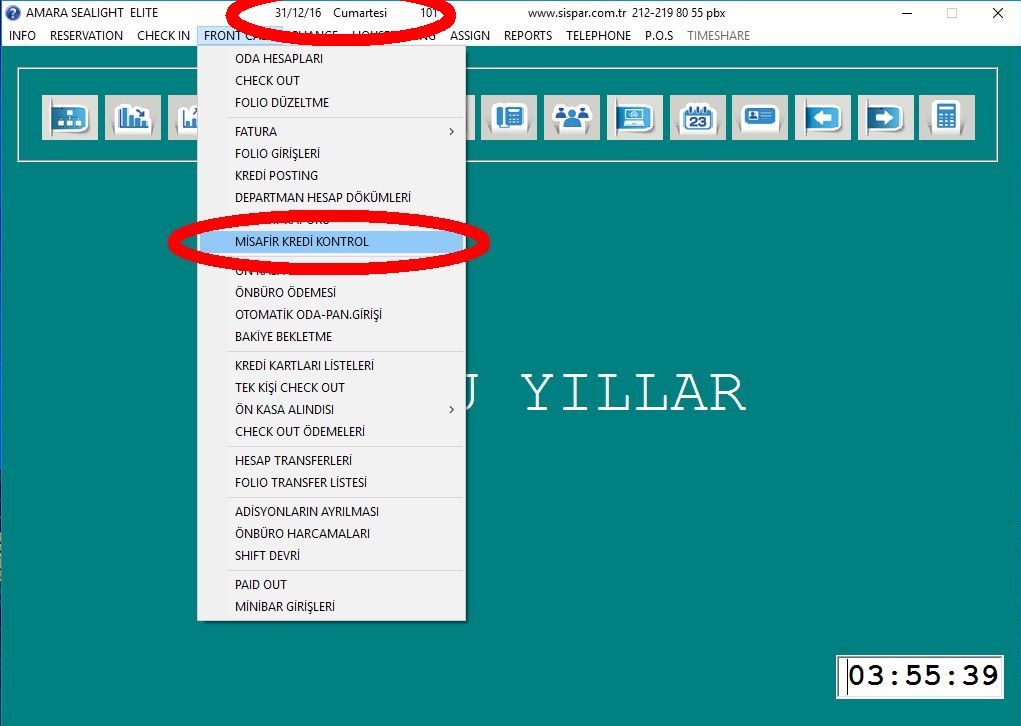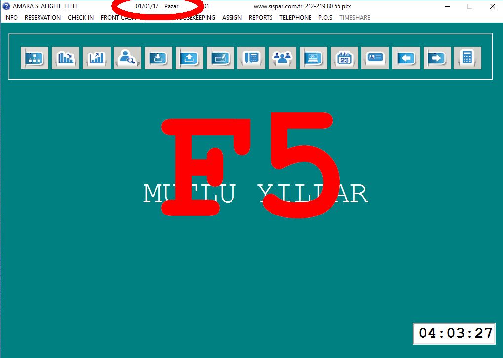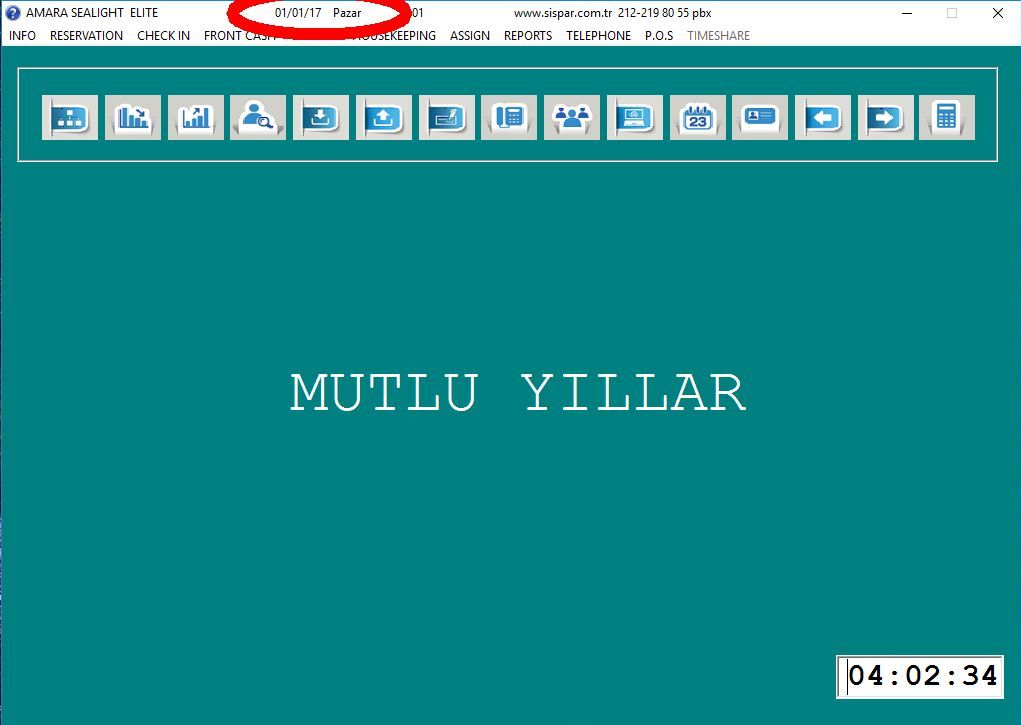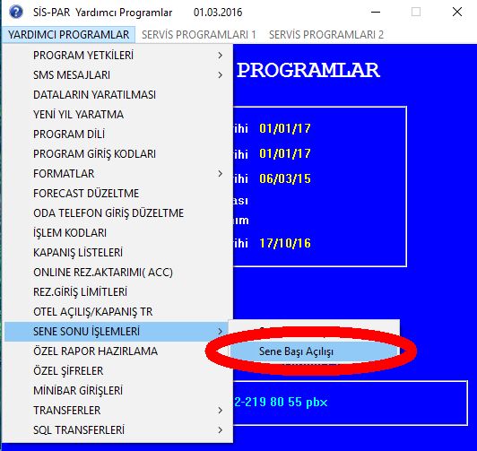 - 1 Ocak tarihine geçildiğinde, 1 Ocakta ait hiçbir işlem yapmadan F5 ile tekrar yardımcı programlara girip Sene Sonu işlemlerinden, Sene Başı Açılışı çalıştırın. İşlem kodunuzu girip (E) yapın. 31 Aralıkta krediye atılarak sıfırlanan hesaplar ters işlem ile tekrar odaların hesaplarına geçecektir. Misafir Kredi Kontrol Listeniz, ilk işleme başlamadan önceki listenizle aynı duruma gelecektir. Kontrol edin.