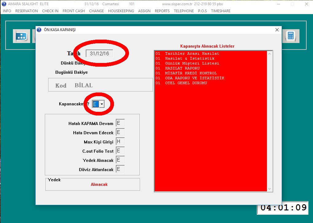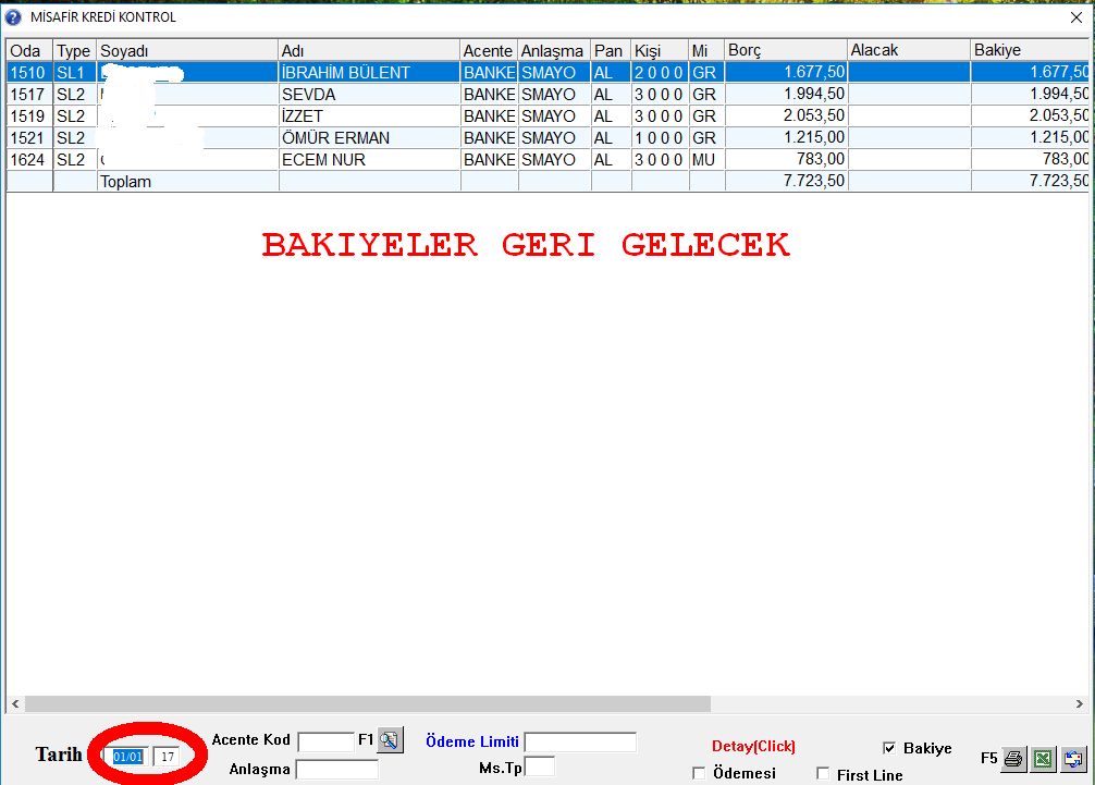 - 31 Aralık işlemlerini tamamlayın, odalarınızı basıp, adisyonlarınızı da girdikten ve hesap kontrollerinizi de yaptıktan sonra, günü kapatacak aşamaya kadar gelin, fakat günü kapatmayın. Son Misafir Kredi Kontrol Listesini alın. (Hesaplar sıfırlanacağı için elinizde bakiye listesi olması için)